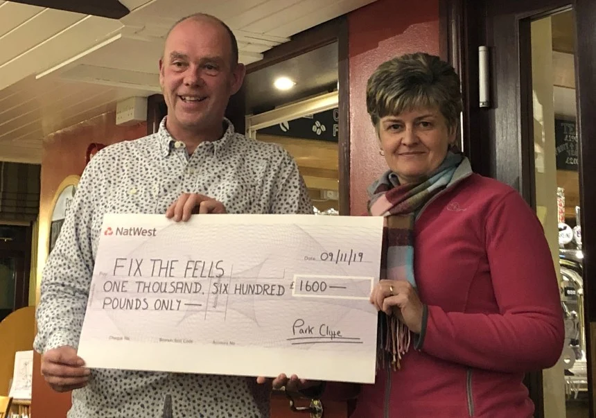 Susan Dickson hands the donation to Steve Tonkin of Fix the Fells which doubled the sum with match funding